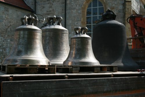 Endlich: Die drei neuen Glocken, die in Karlsruhe gegossen wurden, und die "Stürmerin", die in Nördlingen geschweißt wurde, sind am 3. Juli 2009 wohlbehalten auf der Klosterburg in Kastl angekommen.