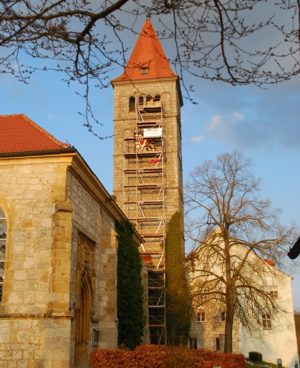 Gerüstaufbau auf der Westseite des Kirchturms wurde